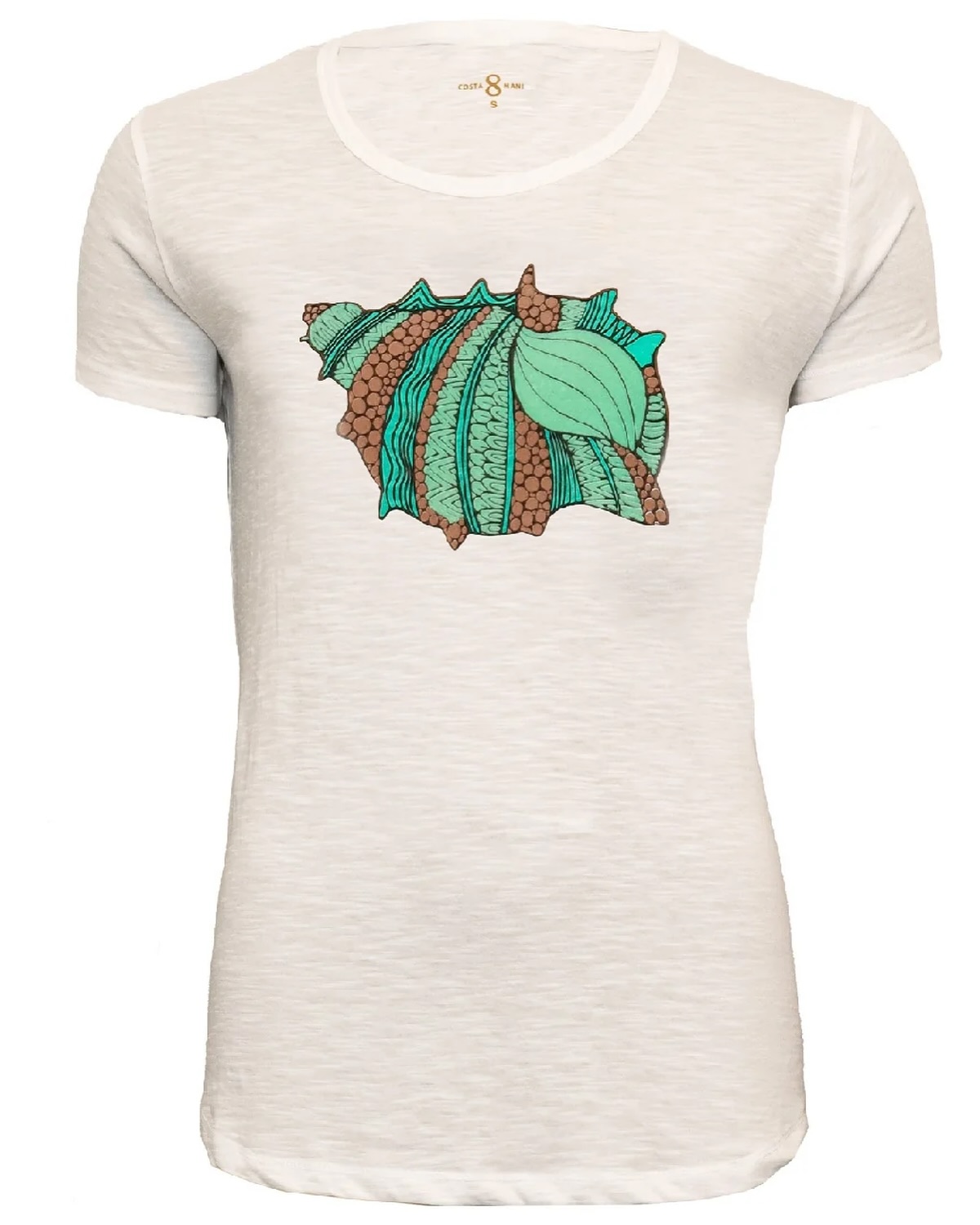 Το κοντομανικο T-shirt Costa Mani εχει λαιμοκοψη και στρογγυλαδες στο κατω μερος. Ειναι κατασκευασμενο απο υψηλης ποιοτητας υλικα με συνθεση 60% cotton και 40% poly και προερχεται απο την Δανια. Ειναι λευκο και η σταμπα βγαινει σε δυο υπεροχα χρωματα γαλαζιο και πρασινο.