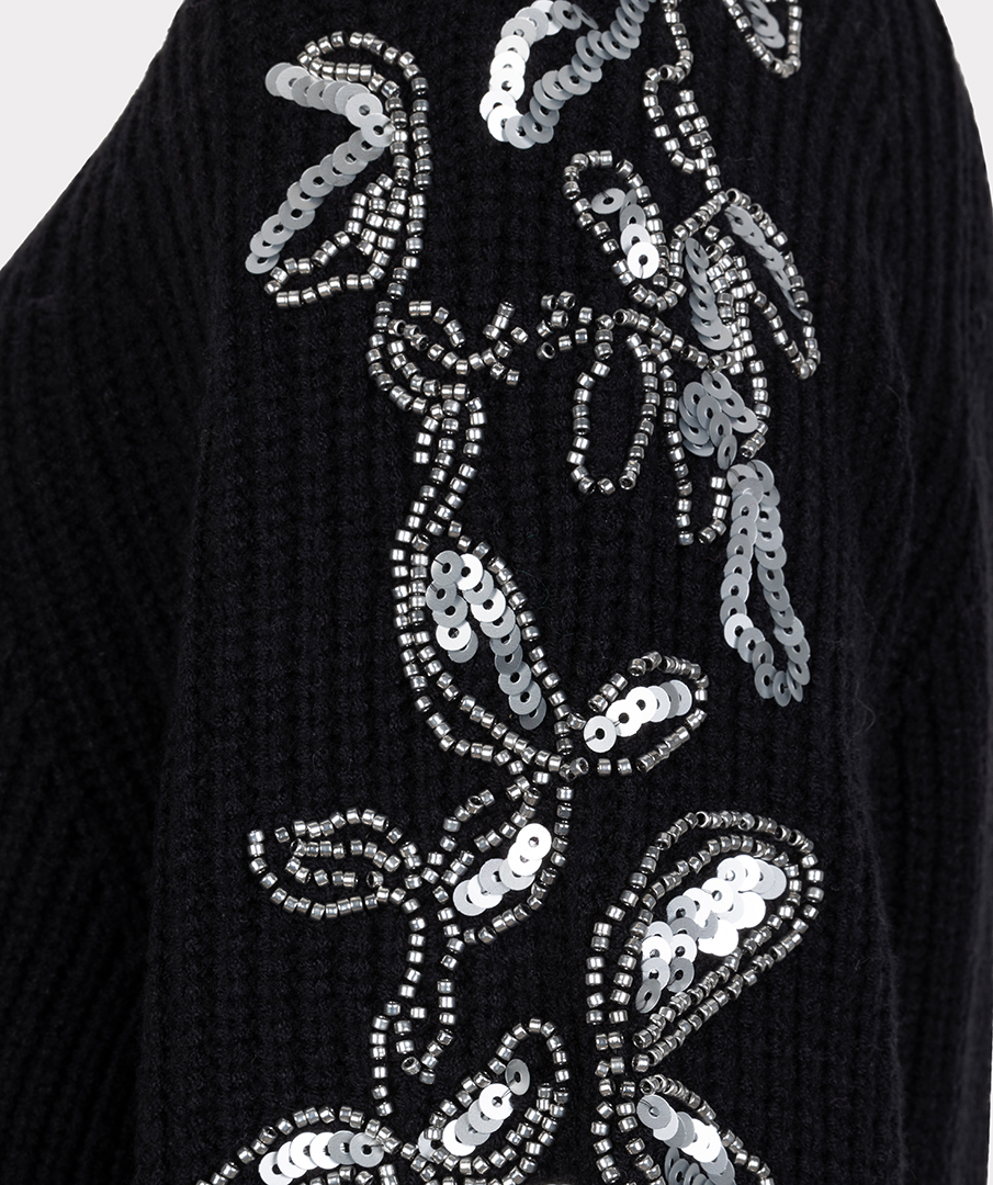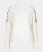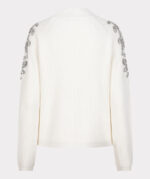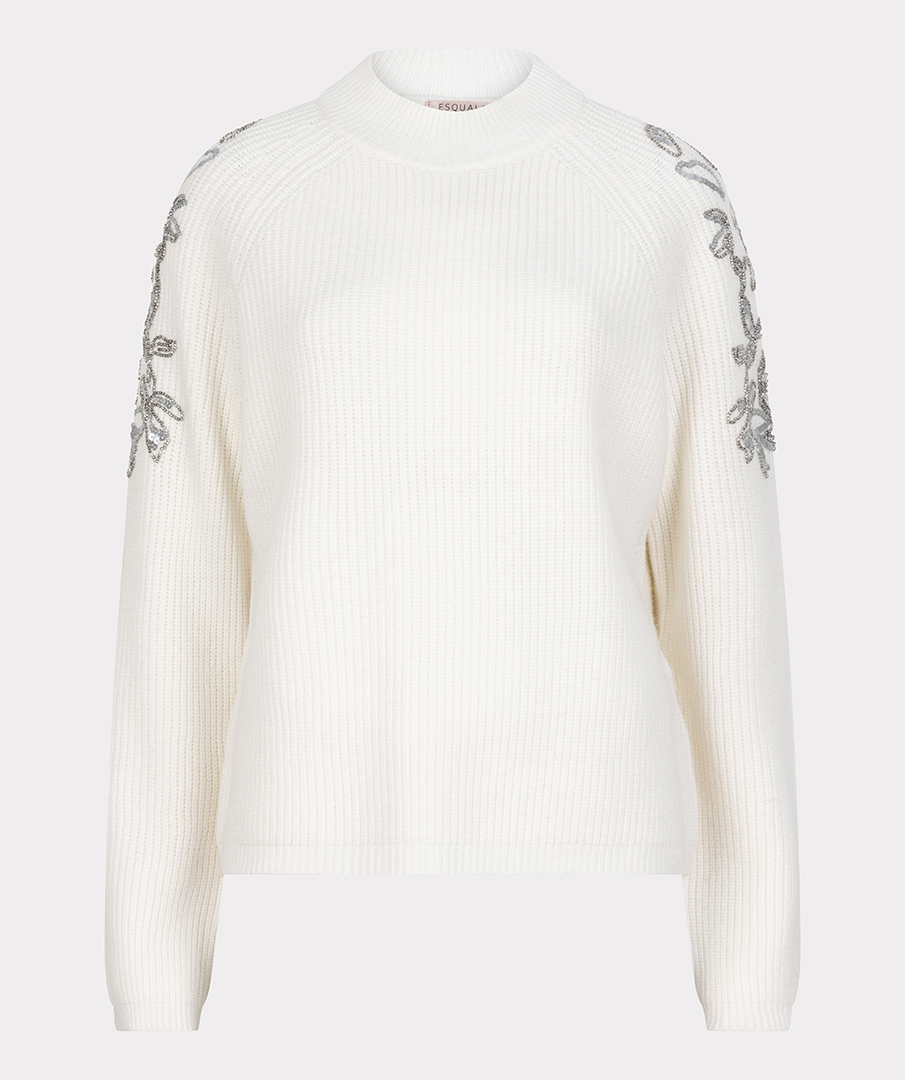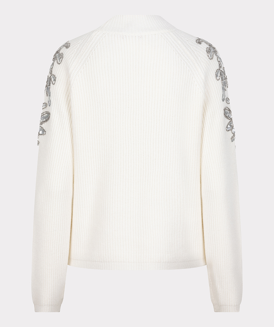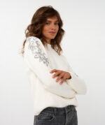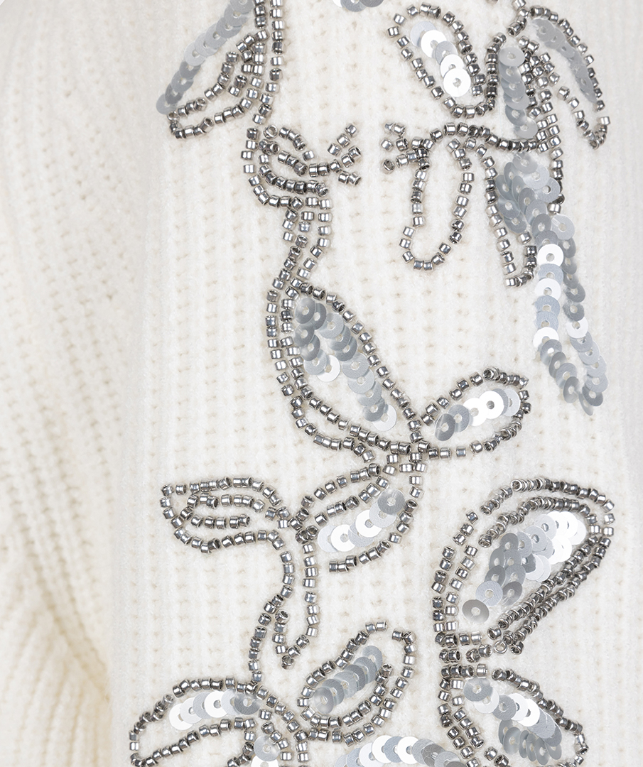 Ζεστό πλεκτό πουλόβερ με όμορφη λεπτομέρεια με παγιέτες και στους δύο ώμους. Το πουλόβερ είναι κατασκευασμένο από 50% βισκόζη, 28% πολυεστέρα και 22% νάιλον και προερχεται απο την Ολλανδια. Υπαρχει σε Off white και μαυρο και τα δυο με ασημι παγιετες.