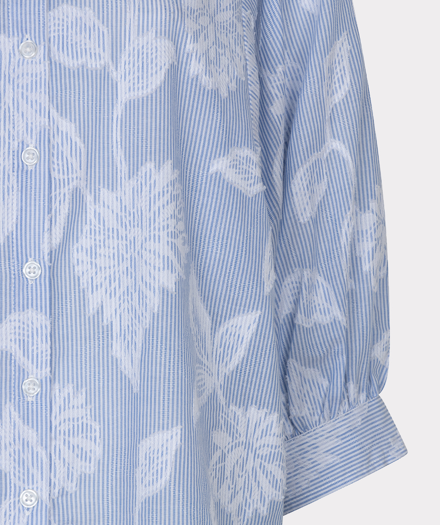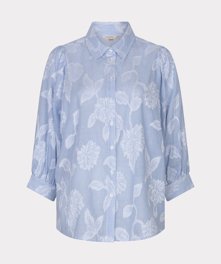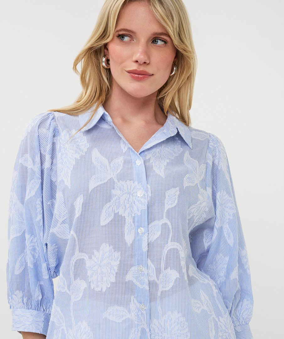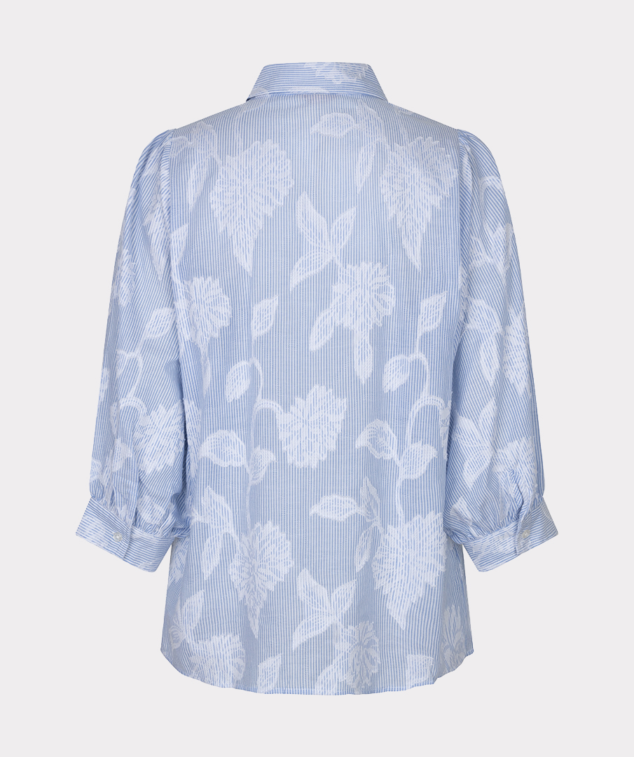 Μια όμορφη μπλούζα φτιαγμένη από ριγέ φλοραλ  ζακάρ ύφασμα. Η μπλούζα έχει γιακά με πέτο, μανίκια με φουσκωτά άκρα και είναι κατασκευασμένη από 100% βαμβάκι.
