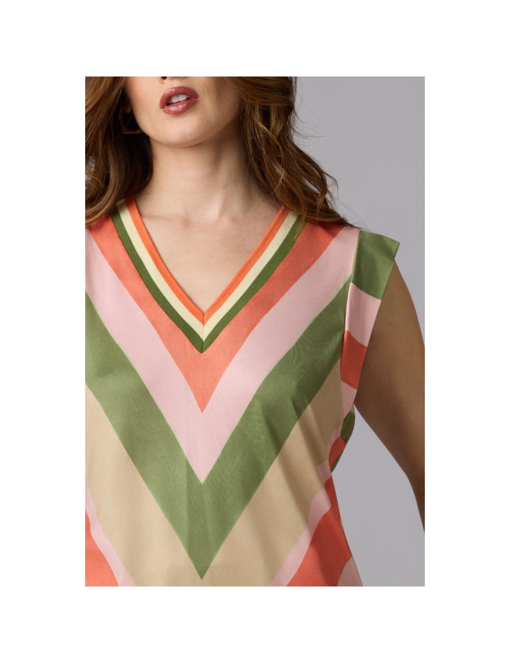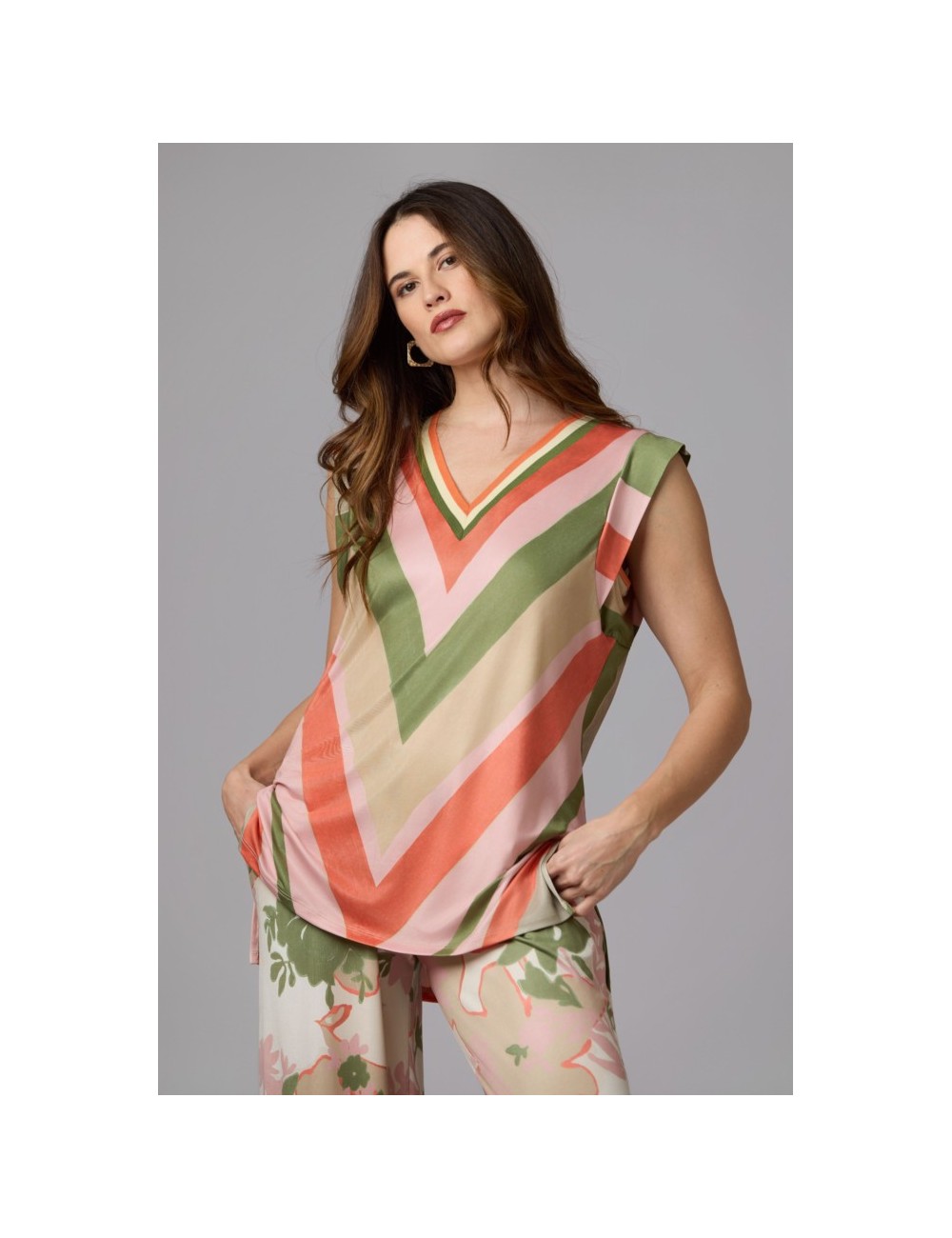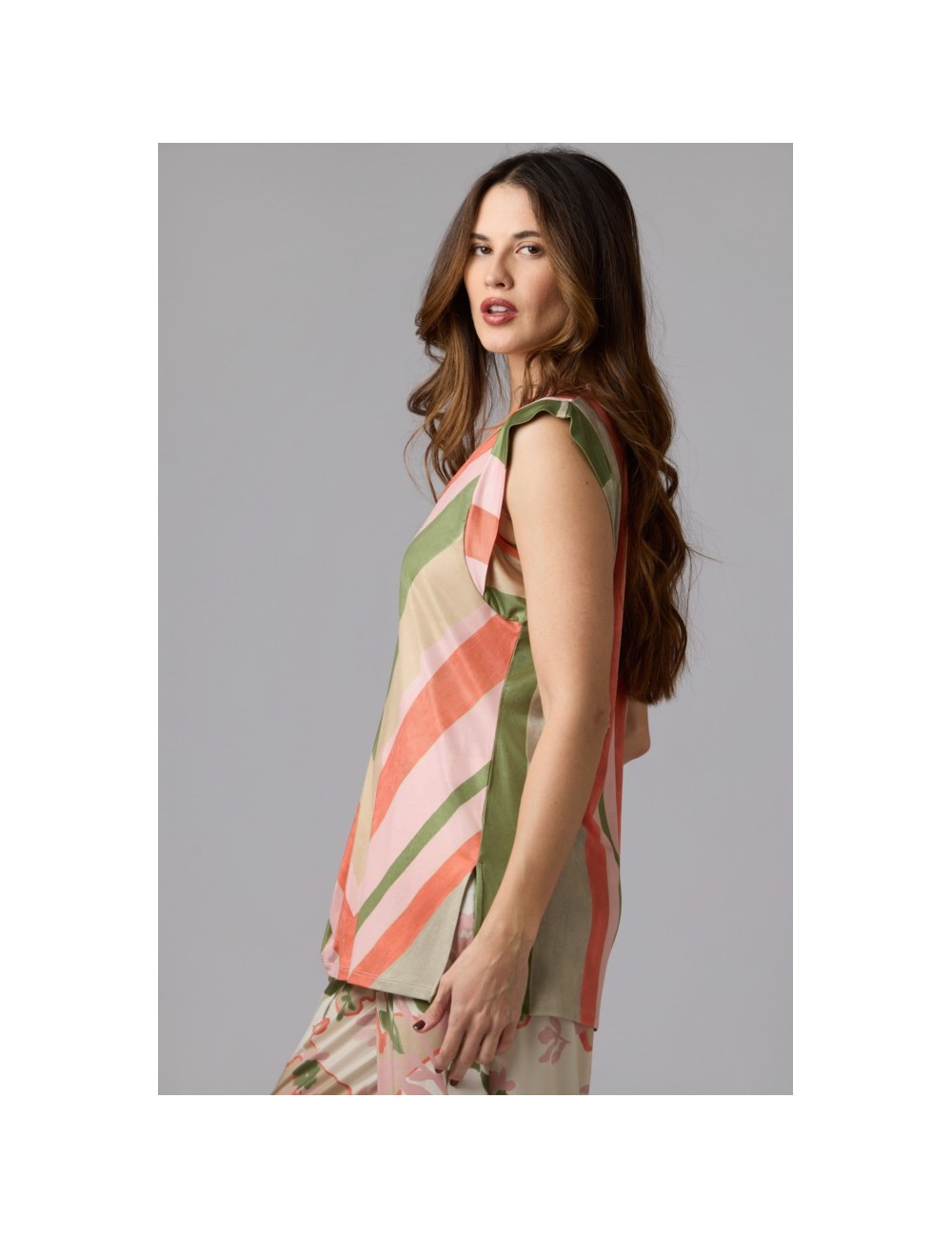 Το συνολο Brezo αποτελειται απο  ελαστικη παντελονα με λαστιχο και τσεπες και κοντομανικη μπλουζα με V neck . Η μπλουζα εχει υπεροχα χρωματα σε γραμμικο σχεδιο και η παντελονα εχει τα ιδια χρωματα σε εμπριμε. Ειναι ενα υπεροχο καλοκαιρινο συνολο. Ειναι κατασκευασμενο απο υψηλης ποιοτητας υλικα με συνθεση 92% polyester και 8% elastane και προερχεται απο την Ισπανια.
