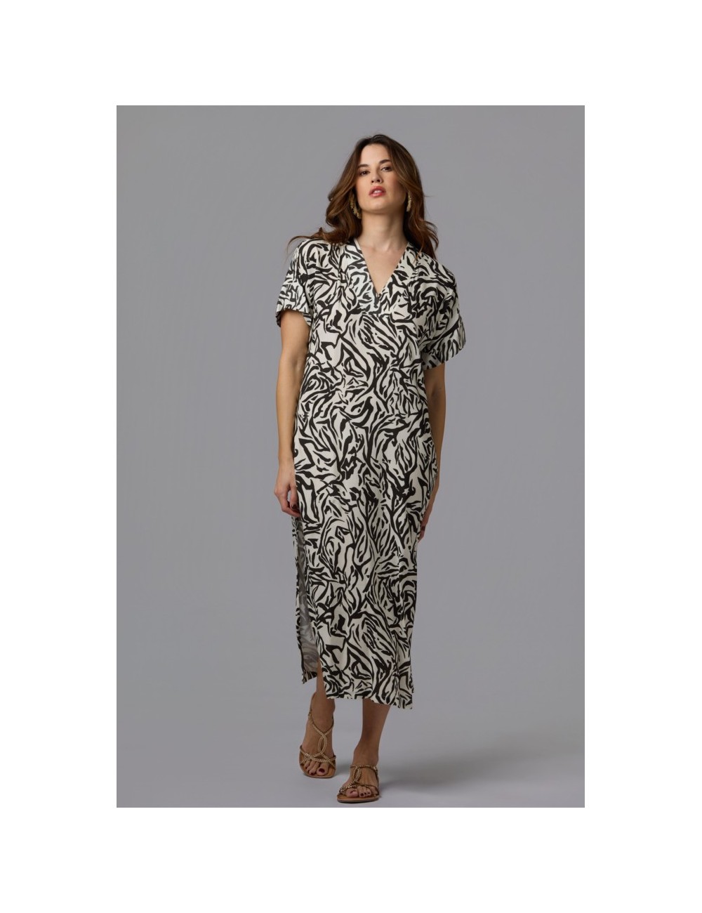 Το φορεμα Rever με V neck και δεσιμο στην πλατη ειναι μακρυ σε ανετη γραμμη με κοντο μανικι και σκισιμο στο πλαι. Ειναι κατασκευασμενο απο υψηλης ποιοτητας υλικα με συνθεση 100% viscose και προερχεται απο την Ισπανια. Ειναι ενα δροσερο καλοκαιρινο φορεμα.