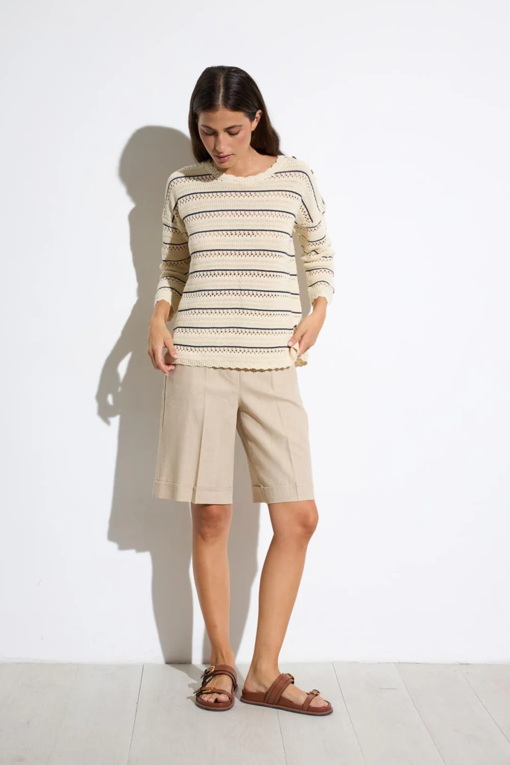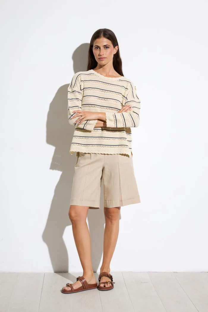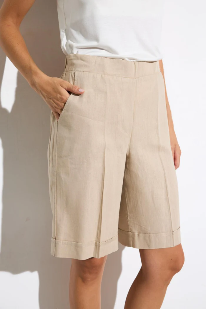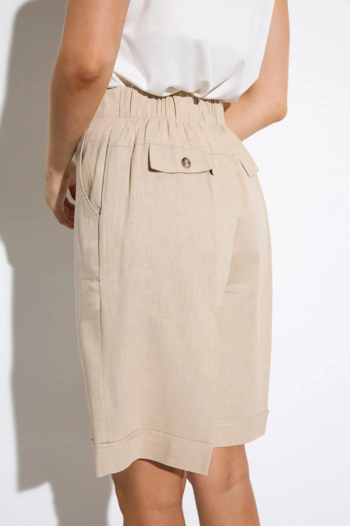 Η βερμουδα Tinta με λαστιχο στην μεση και τσεπες ειναι μεχρι το γονατο και τελειωνει με ρεβερ. Ειναι κατασκευασμενη απο υψηλης ποιοτητας υλικα με συνθεση 100% βαμβακι και προερχεται απο την Ισπανια. Υπαρχει σε μπεζ και indigo blue.